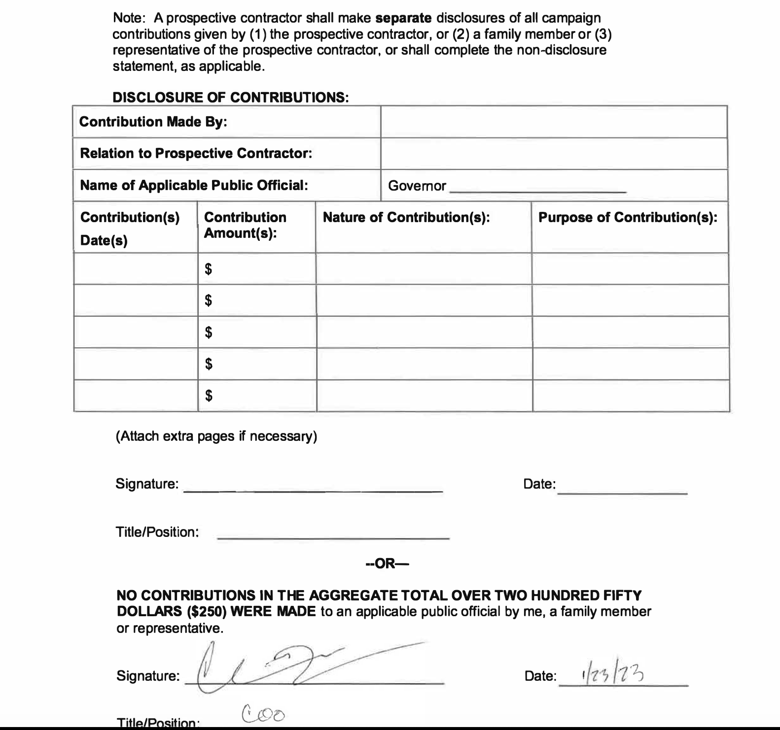 ADDITIONALLY, the form also asks about any political contributions from the contractor made to any candidate or elected official in the state within the last two years over $250. Agenda also circled “no” on that question.